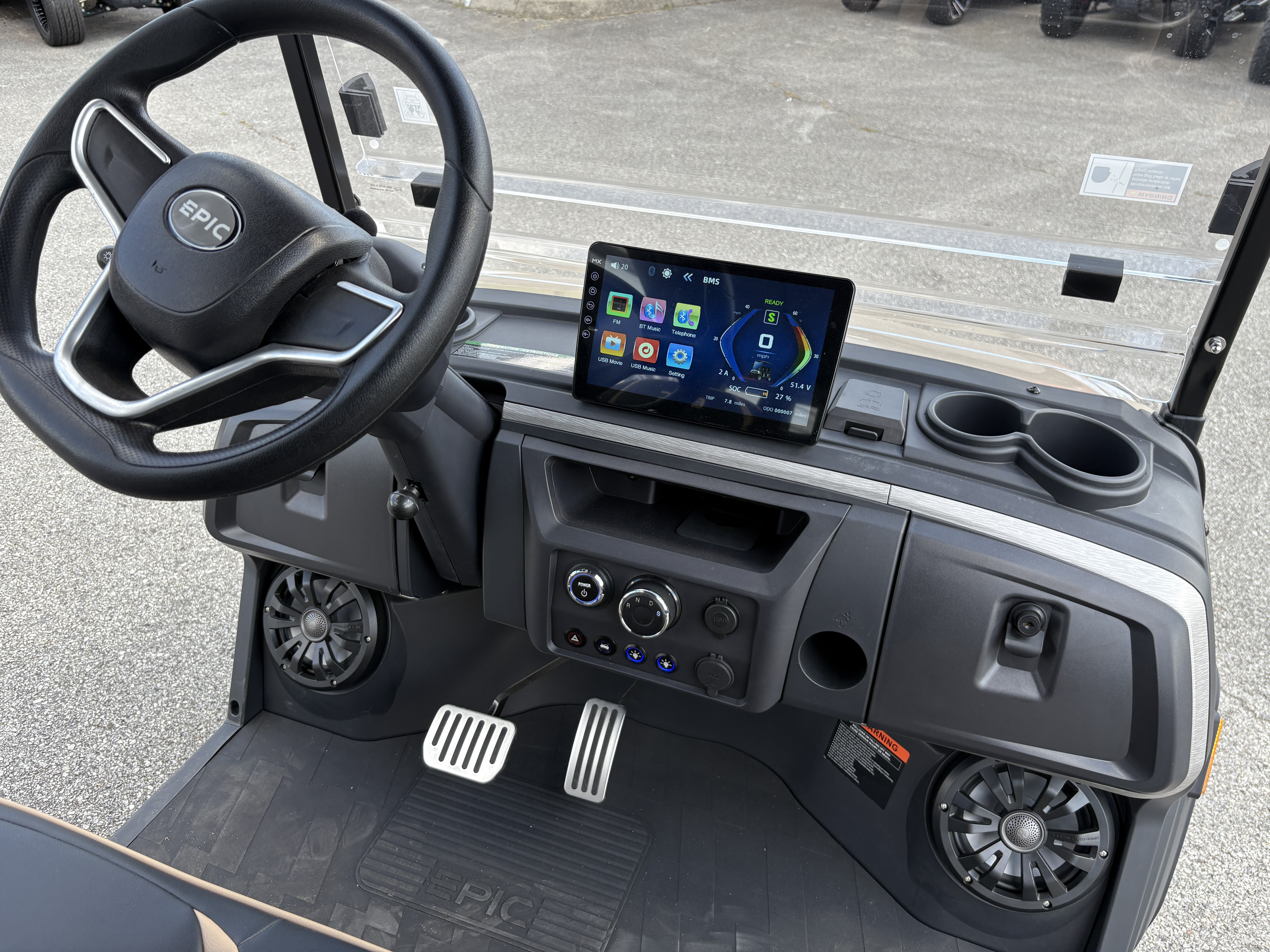 The brand new Epic E40FX is the best golf cart on the market today! Furnished with every imaginable feature, the forward-facing four-seater Epic E40FX comes in six stylish colors and two height options. Premium 14” wheels and street-ready tires provide a solid foundation for every journey on every terrain, no matter what lift height is selected. With an abundance of storage, superior built-in marine-grade sound system and speakers, and stunning accent lighting, this Epic E40FX golf cart illuminates the possibilities for fun and adventure.
